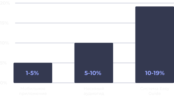 Процент использования аудиогидов разного типа относительно общего числа посетителей музеев. На базе опыта работы более чем с 200 музеями в Европе*